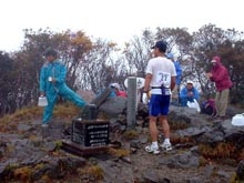 (右)市房山山頂。雨はほぼ止んでいたが、濃い霧で眺望なし。登山者もまばらだった。