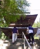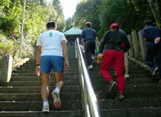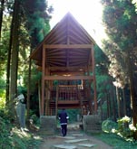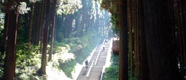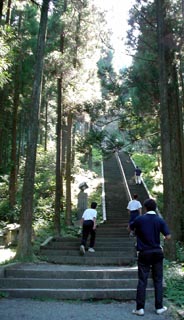 何もない山の中に突如現れる有料駐車場(300円)と土産物店。誰もいないかと思っていたら以外と賑やか。小さな子供が一緒の家族連れも多い。 石段頂上までの所要時間は、ゆっくりで90分、頑張って60分、早い人なら40分とのこと。 | |