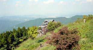 釈迦院までの道は少し下り気味の石畳。右手(南西?)の展望が良い。遠くの山の間から、さらに標高の高そうな山が頂上をのぞかせていたが、何という山かは分からなかった。 |