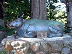 (左)境内の片隅にある宝牛。一つの願い事を念じながら牛を撫でると、願いが叶うという。