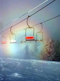 早朝や夕方、太陽を背にして山頂に立つ人の影が、前方の霧や雲に大きく拡大されて映る現象。 影のまわりに光の輪ができることもある。 ドイツ中部のブロッケン山(1142m)でよく見られるのでこの名がある。 別名「ブロッケンの妖怪」 焼額山山頂北面の奥志賀スキー場で撮影(03.02.13 16:00頃)。個人的には、これを 見られただけで志賀高原に来た甲斐があった。いや、もちろんスキーは存分に 楽しませてもらいましたが・・・ |