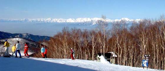 西館山リフト頂上からの展望。北アルプスの純白の稜線が続く光景は息をのむ美しさ。