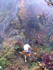 恐いには恐いが、落ちてゆく先が霧で見えないぶん、莇ヶ岳の鎖場より気は楽だった。