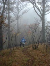 木の根、梯子、ロープなどを頼りに、山頂を目指す。とてもマラソンにはならない。