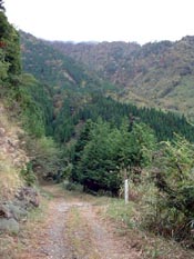 延々と続く急な下り道。周囲の木々が自然林からヒノキの植林に変わると林道は近い。
